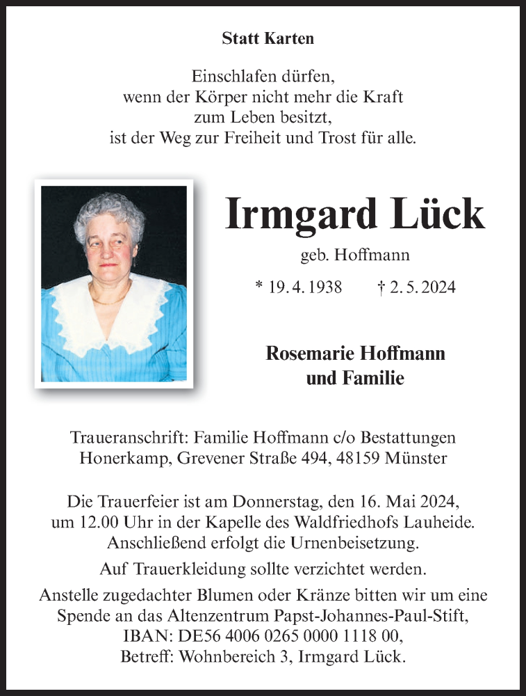Hier finden Sie alle Traueranzeigen aus der Zeitung, die bisher für Irmgard Lück erschienen sind. Weitere Traueranzeigen, die in der Zeitung erscheinen, werden hier ebenfalls aufgelistet