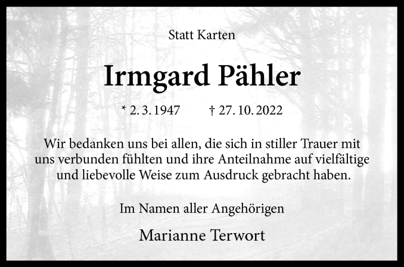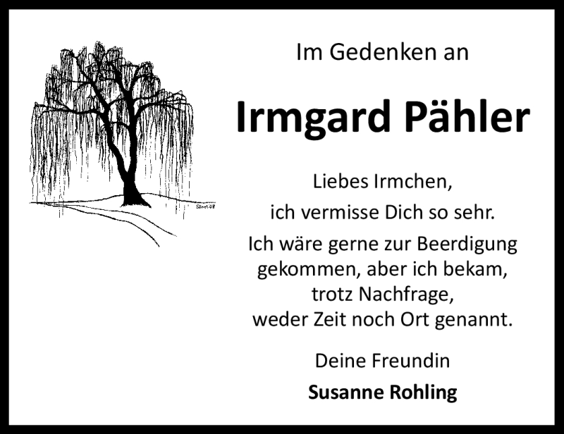 Hier finden Sie alle Traueranzeigen aus der Zeitung, die bisher für Irmgard Pähler erschienen sind. Weitere Traueranzeigen, die in der Zeitung erscheinen, werden hier ebenfalls aufgelistet