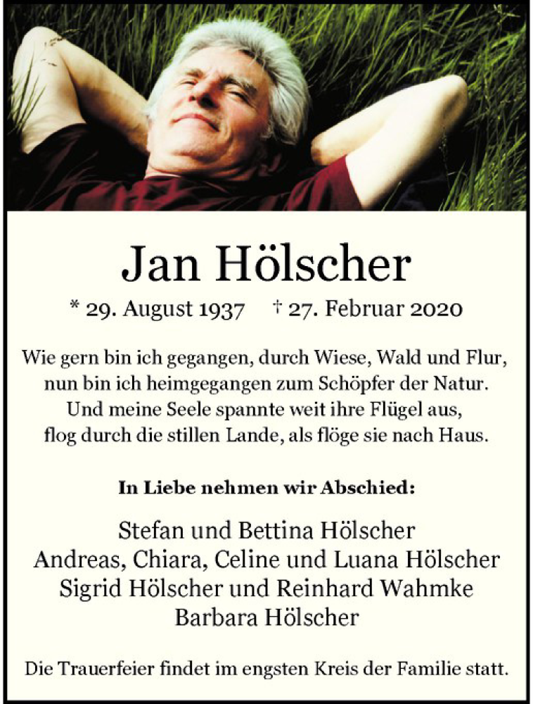 Hier finden Sie alle Traueranzeigen aus der Zeitung, die bisher für JaN Hölscher erschienen sind. Weitere Traueranzeigen, die in der Zeitung erscheinen, werden hier ebenfalls aufgelistet