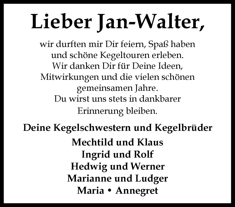 Hier finden Sie alle Traueranzeigen aus der Zeitung, die bisher für Jan-Walter Tewes erschienen sind. Weitere Traueranzeigen, die in der Zeitung erscheinen, werden hier ebenfalls aufgelistet