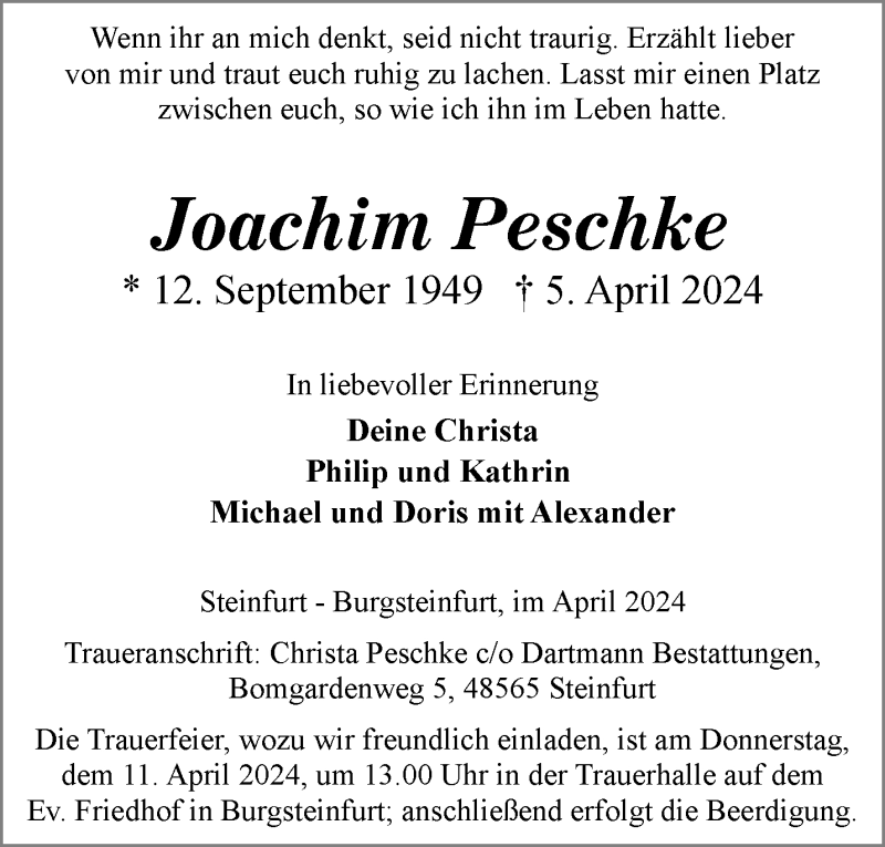 Hier finden Sie alle Traueranzeigen aus der Zeitung, die bisher für Joachim Peschke erschienen sind. Weitere Traueranzeigen, die in der Zeitung erscheinen, werden hier ebenfalls aufgelistet