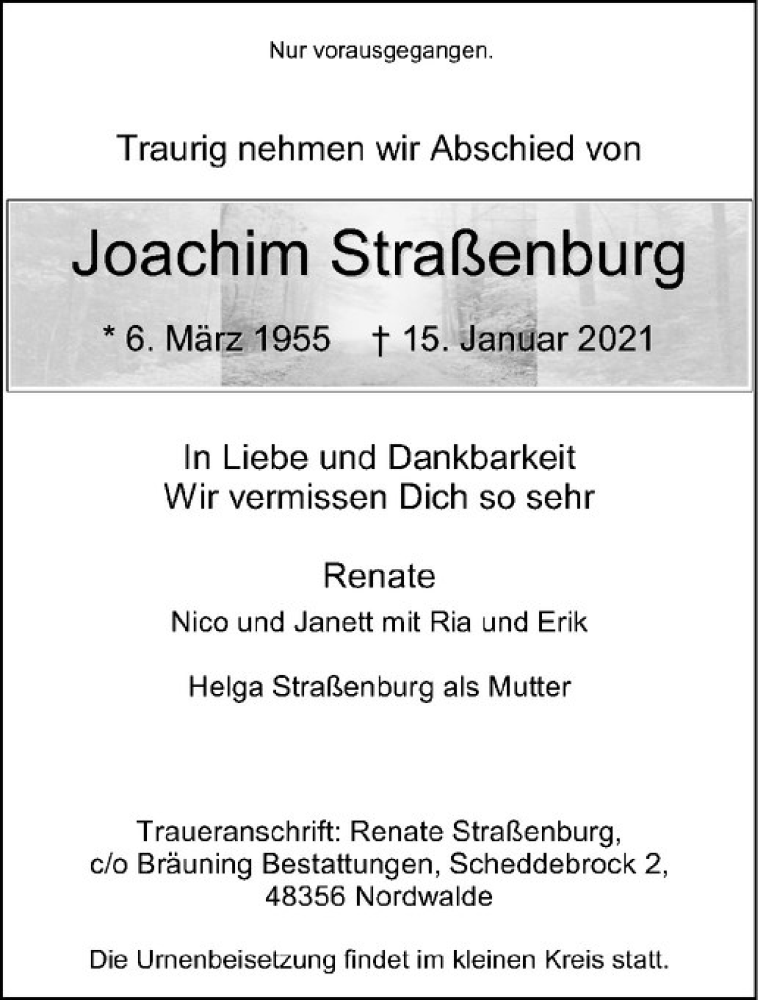 Hier finden Sie alle Traueranzeigen aus der Zeitung, die bisher für Joachim Straßenburg erschienen sind. Weitere Traueranzeigen, die in der Zeitung erscheinen, werden hier ebenfalls aufgelistet
