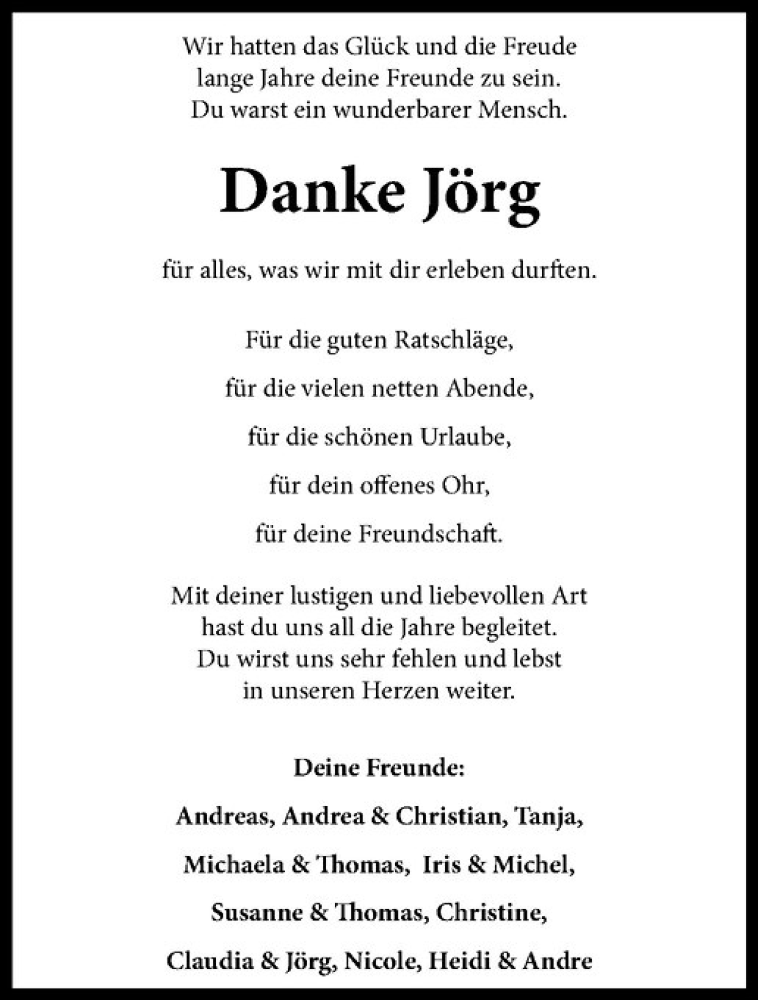 Hier finden Sie alle Traueranzeigen aus der Zeitung, die bisher für Jörg erschienen sind. Weitere Traueranzeigen, die in der Zeitung erscheinen, werden hier ebenfalls aufgelistet