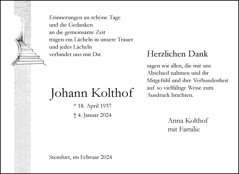 Hier finden Sie alle Traueranzeigen aus der Zeitung, die bisher für Johann Kolthof erschienen sind. Weitere Traueranzeigen, die in der Zeitung erscheinen, werden hier ebenfalls aufgelistet