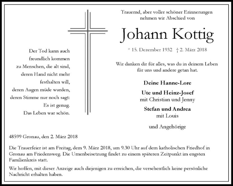 Hier finden Sie alle Traueranzeigen aus der Zeitung, die bisher für Johann Kottig erschienen sind. Weitere Traueranzeigen, die in der Zeitung erscheinen, werden hier ebenfalls aufgelistet