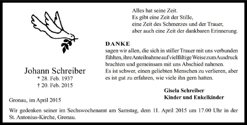 Hier finden Sie alle Traueranzeigen aus der Zeitung, die bisher für Johann Schreiber erschienen sind. Weitere Traueranzeigen, die in der Zeitung erscheinen, werden hier ebenfalls aufgelistet