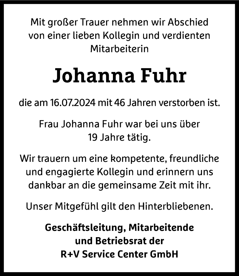 Hier finden Sie alle Traueranzeigen aus der Zeitung, die bisher für Johanna Fuhr erschienen sind. Weitere Traueranzeigen, die in der Zeitung erscheinen, werden hier ebenfalls aufgelistet