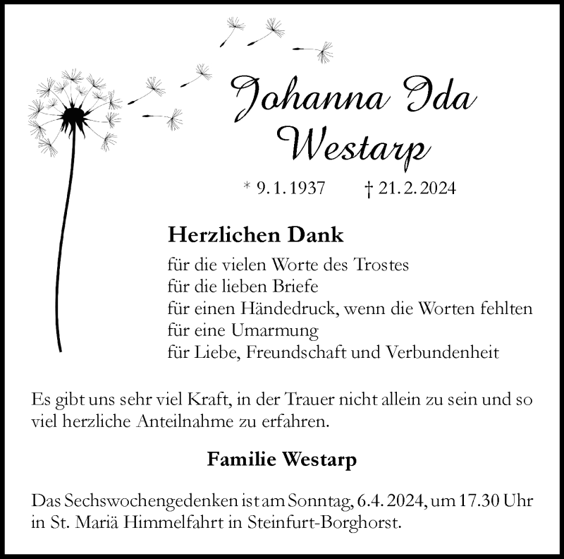 Hier finden Sie alle Traueranzeigen aus der Zeitung, die bisher für Johanna Ida Westarp erschienen sind. Weitere Traueranzeigen, die in der Zeitung erscheinen, werden hier ebenfalls aufgelistet