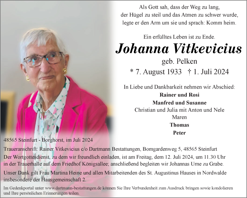 Hier finden Sie alle Traueranzeigen aus der Zeitung, die bisher für Johanna Vitkevicius erschienen sind. Weitere Traueranzeigen, die in der Zeitung erscheinen, werden hier ebenfalls aufgelistet