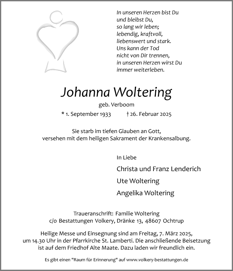 Hier finden Sie alle Traueranzeigen aus der Zeitung, die bisher für Johanna Woltering erschienen sind. Weitere Traueranzeigen, die in der Zeitung erscheinen, werden hier ebenfalls aufgelistet