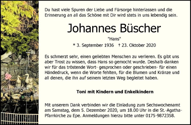 Hier finden Sie alle Traueranzeigen aus der Zeitung, die bisher für Johannes Büscher erschienen sind. Weitere Traueranzeigen, die in der Zeitung erscheinen, werden hier ebenfalls aufgelistet