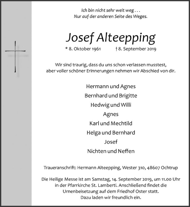 Hier finden Sie alle Traueranzeigen aus der Zeitung, die bisher für Josef Altepping erschienen sind. Weitere Traueranzeigen, die in der Zeitung erscheinen, werden hier ebenfalls aufgelistet