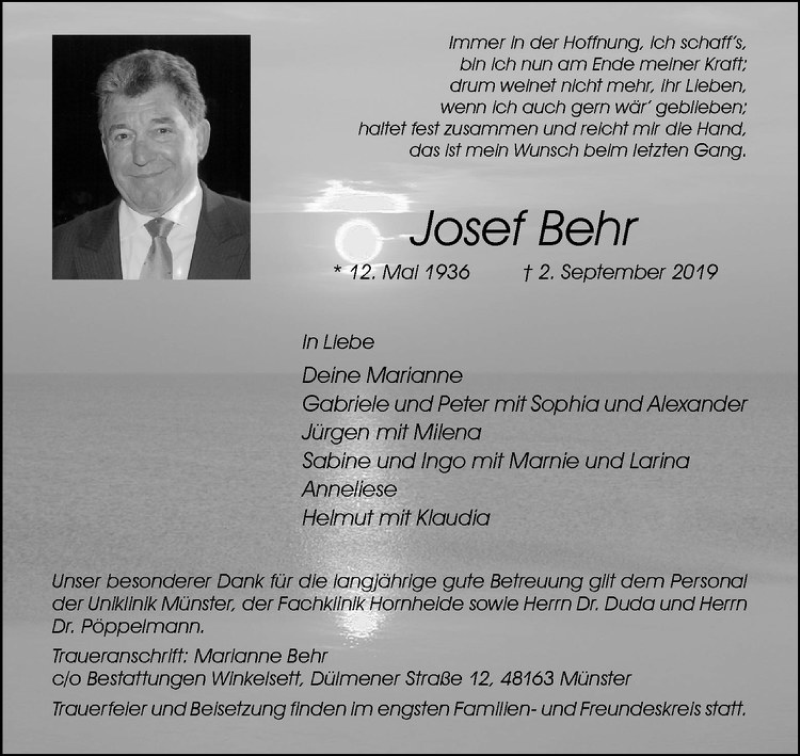Hier finden Sie alle Traueranzeigen aus der Zeitung, die bisher für Josef Behr erschienen sind. Weitere Traueranzeigen, die in der Zeitung erscheinen, werden hier ebenfalls aufgelistet