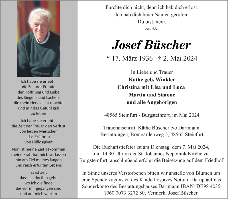 Hier finden Sie alle Traueranzeigen aus der Zeitung, die bisher für Josef Büscher erschienen sind. Weitere Traueranzeigen, die in der Zeitung erscheinen, werden hier ebenfalls aufgelistet