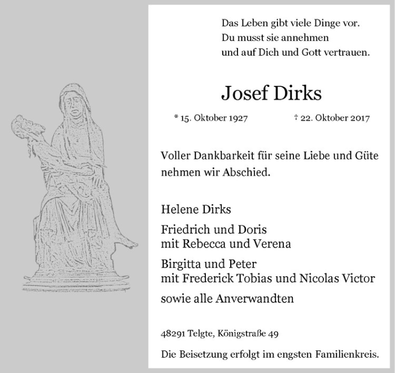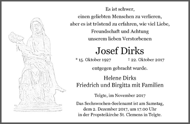 Hier finden Sie alle Traueranzeigen aus der Zeitung, die bisher für Josef Dirks erschienen sind. Weitere Traueranzeigen, die in der Zeitung erscheinen, werden hier ebenfalls aufgelistet