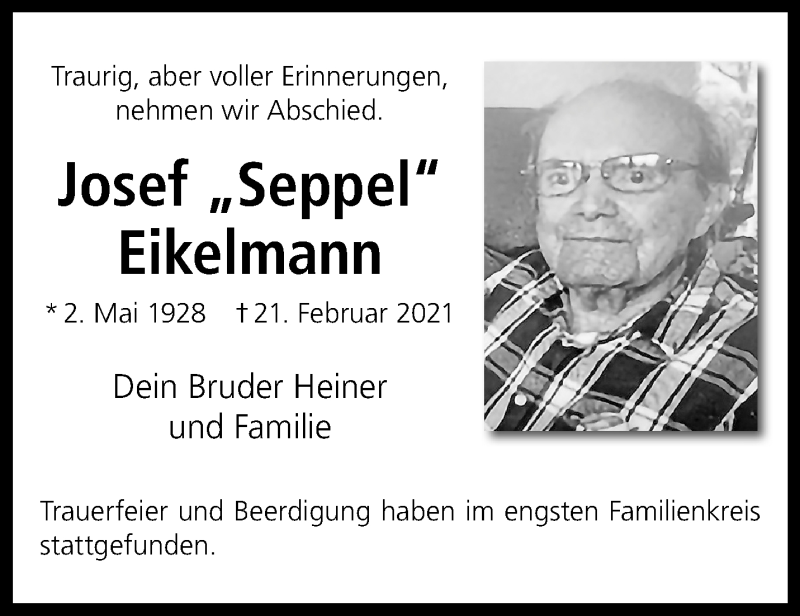 Hier finden Sie alle Traueranzeigen aus der Zeitung, die bisher für Josef Eikelmann erschienen sind. Weitere Traueranzeigen, die in der Zeitung erscheinen, werden hier ebenfalls aufgelistet