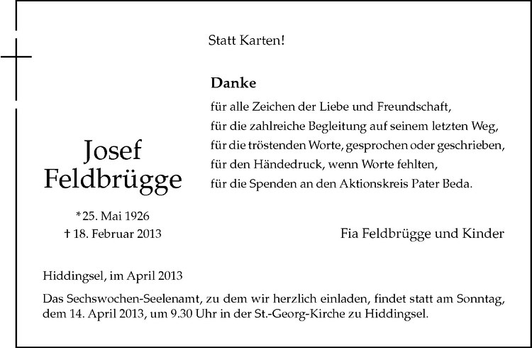 Hier finden Sie alle Traueranzeigen aus der Zeitung, die bisher für Josef Feldbrügge erschienen sind. Weitere Traueranzeigen, die in der Zeitung erscheinen, werden hier ebenfalls aufgelistet