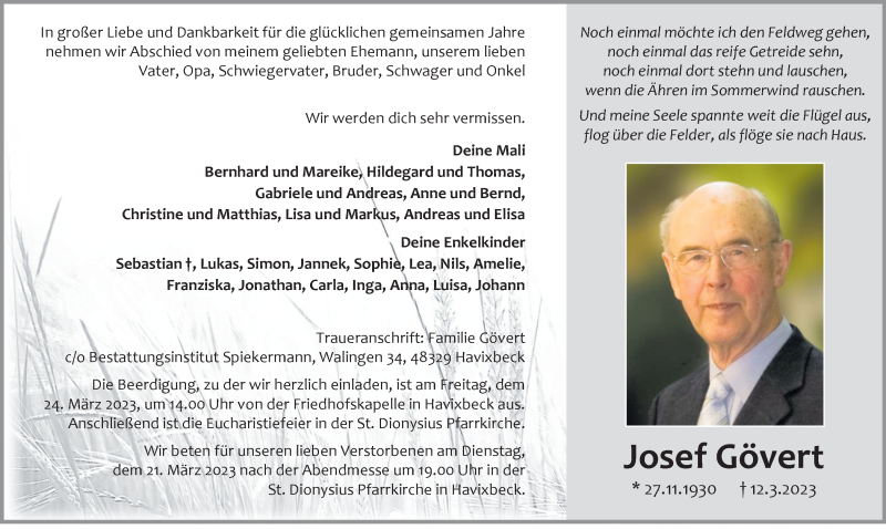 Hier finden Sie alle Traueranzeigen aus der Zeitung, die bisher für Josef Gövert erschienen sind. Weitere Traueranzeigen, die in der Zeitung erscheinen, werden hier ebenfalls aufgelistet