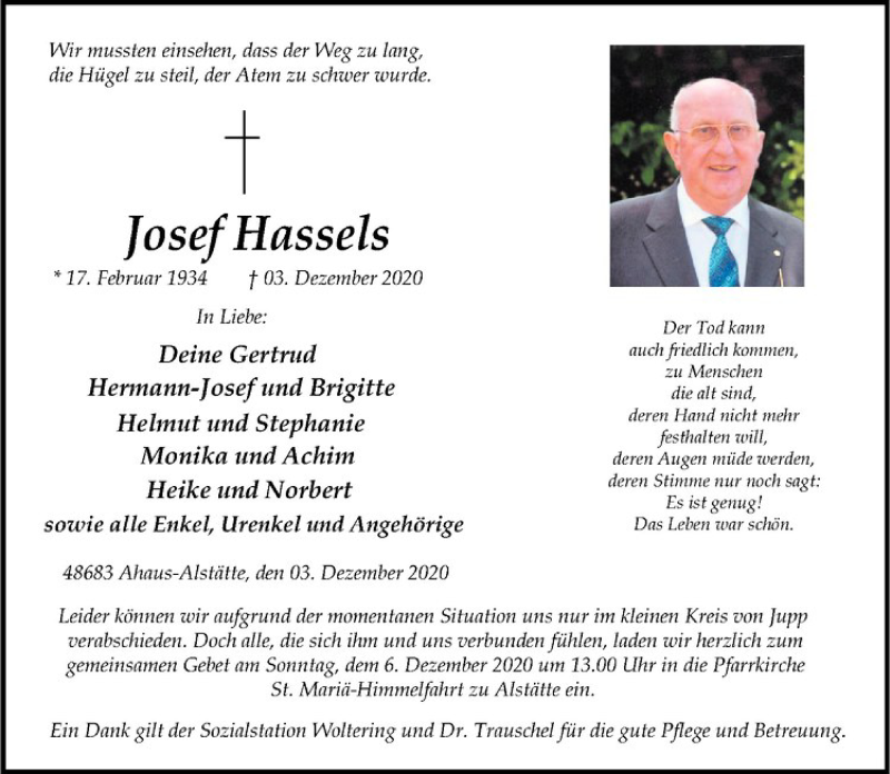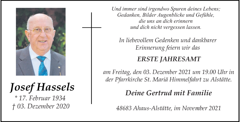 Hier finden Sie alle Traueranzeigen aus der Zeitung, die bisher für Josef Hassels erschienen sind. Weitere Traueranzeigen, die in der Zeitung erscheinen, werden hier ebenfalls aufgelistet