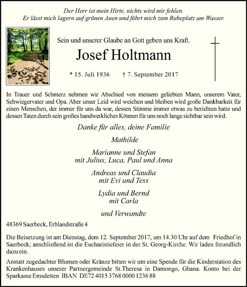Hier finden Sie alle Traueranzeigen aus der Zeitung, die bisher für Josef Holtmann erschienen sind. Weitere Traueranzeigen, die in der Zeitung erscheinen, werden hier ebenfalls aufgelistet