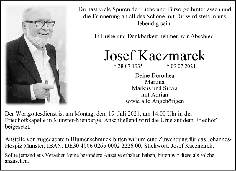 Hier finden Sie alle Traueranzeigen aus der Zeitung, die bisher für Josef Kaczmarek erschienen sind. Weitere Traueranzeigen, die in der Zeitung erscheinen, werden hier ebenfalls aufgelistet
