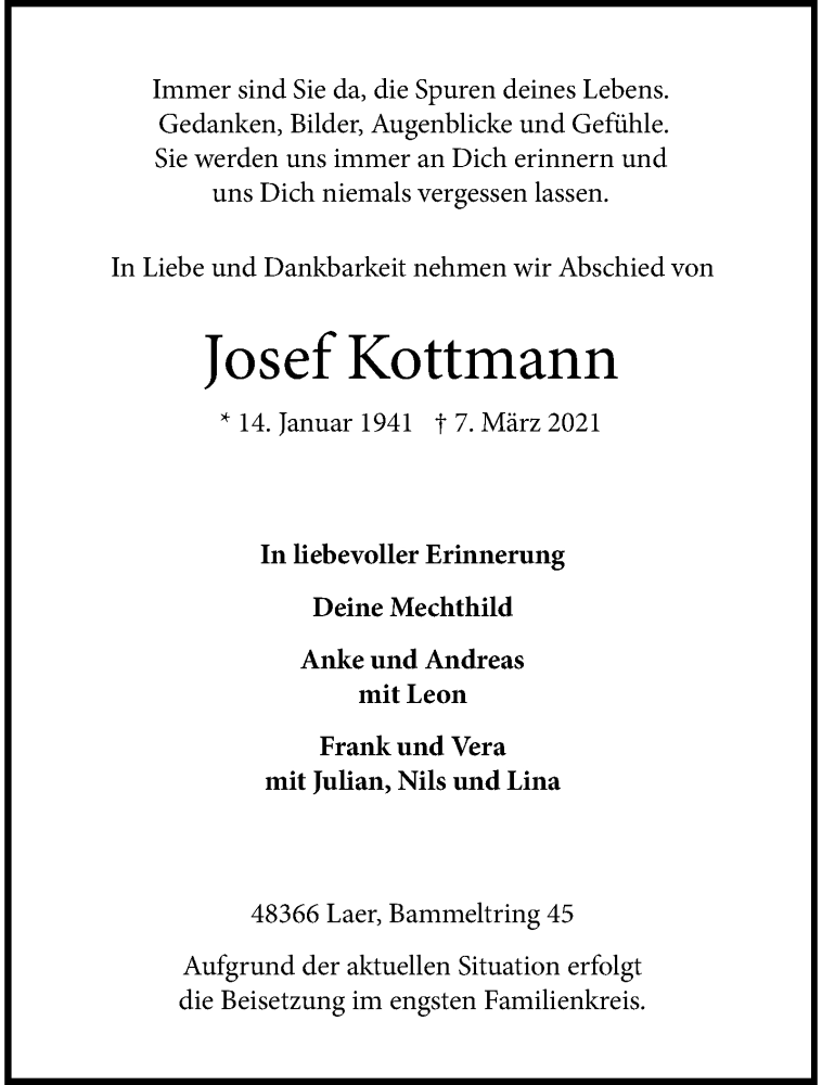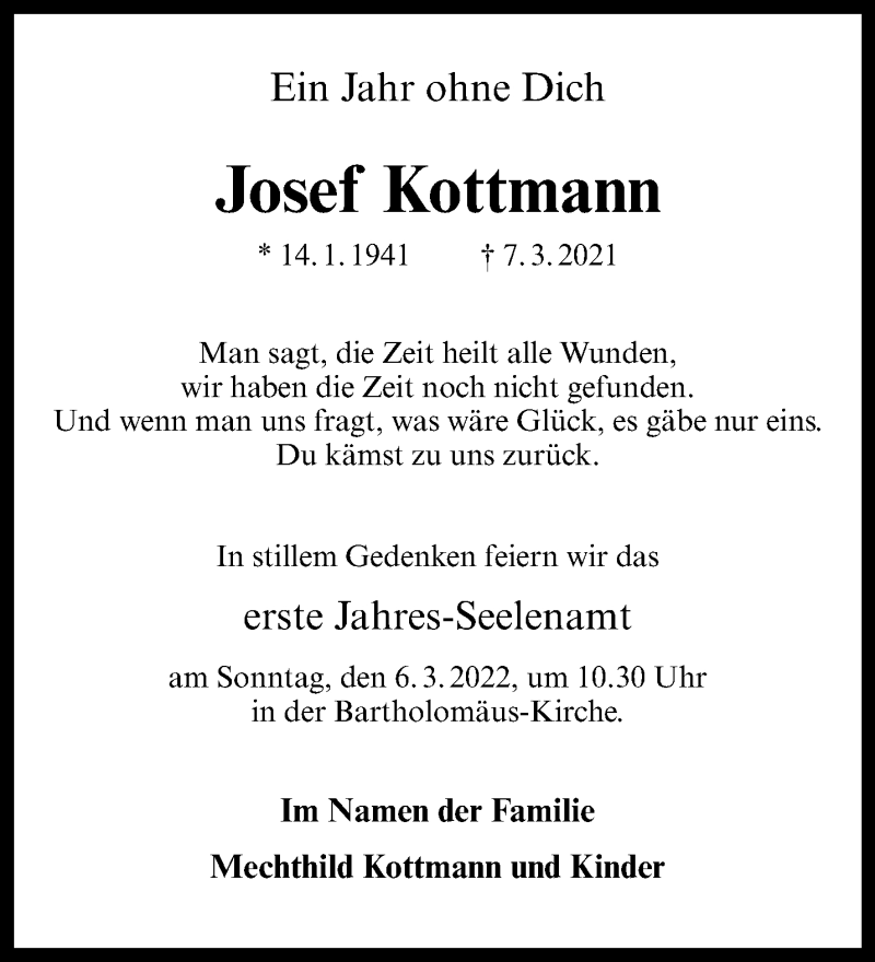 Hier finden Sie alle Traueranzeigen aus der Zeitung, die bisher für Josef Kottmann erschienen sind. Weitere Traueranzeigen, die in der Zeitung erscheinen, werden hier ebenfalls aufgelistet