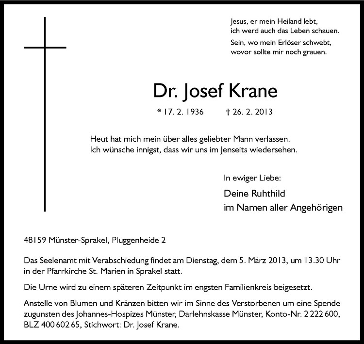 Hier finden Sie alle Traueranzeigen aus der Zeitung, die bisher für Josef Krane erschienen sind. Weitere Traueranzeigen, die in der Zeitung erscheinen, werden hier ebenfalls aufgelistet