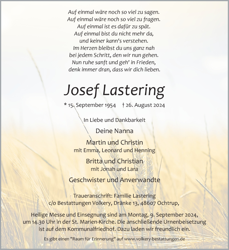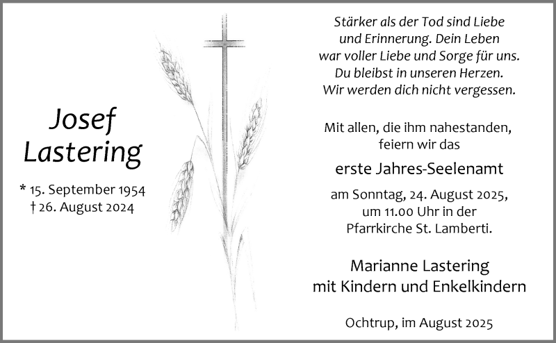 Hier finden Sie alle Traueranzeigen aus der Zeitung, die bisher für Josef Lastering erschienen sind. Weitere Traueranzeigen, die in der Zeitung erscheinen, werden hier ebenfalls aufgelistet