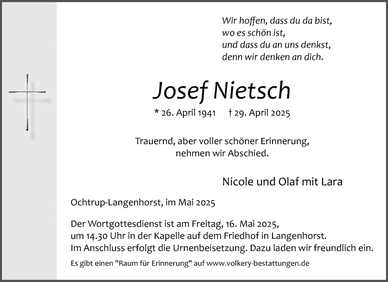 Hier finden Sie alle Traueranzeigen aus der Zeitung, die bisher für Josef Nietsch erschienen sind. Weitere Traueranzeigen, die in der Zeitung erscheinen, werden hier ebenfalls aufgelistet