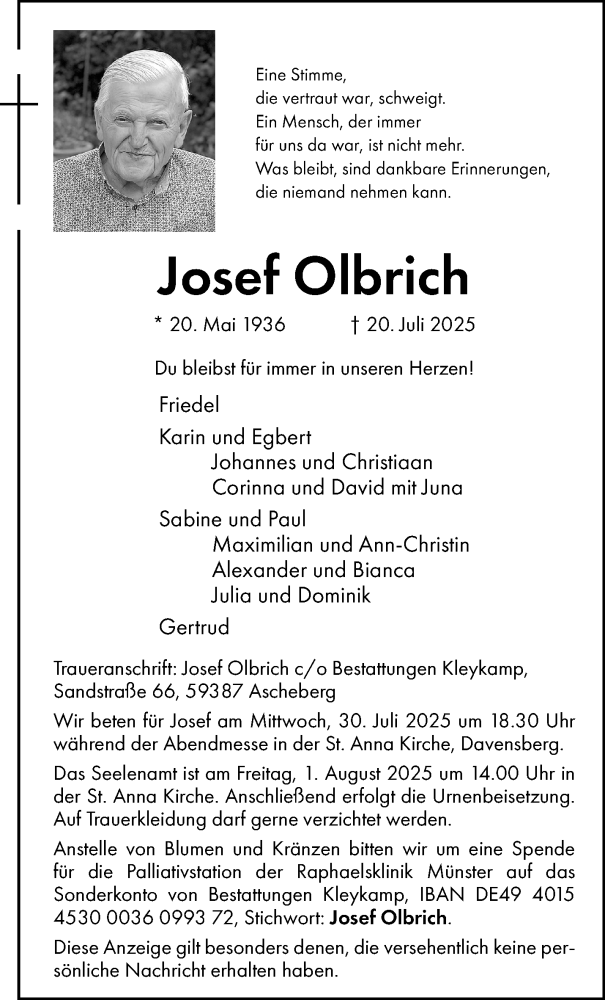 Hier finden Sie alle Traueranzeigen aus der Zeitung, die bisher für Josef Olbrich erschienen sind. Weitere Traueranzeigen, die in der Zeitung erscheinen, werden hier ebenfalls aufgelistet