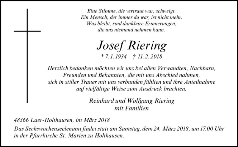 Hier finden Sie alle Traueranzeigen aus der Zeitung, die bisher für Josef Riering erschienen sind. Weitere Traueranzeigen, die in der Zeitung erscheinen, werden hier ebenfalls aufgelistet