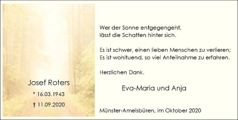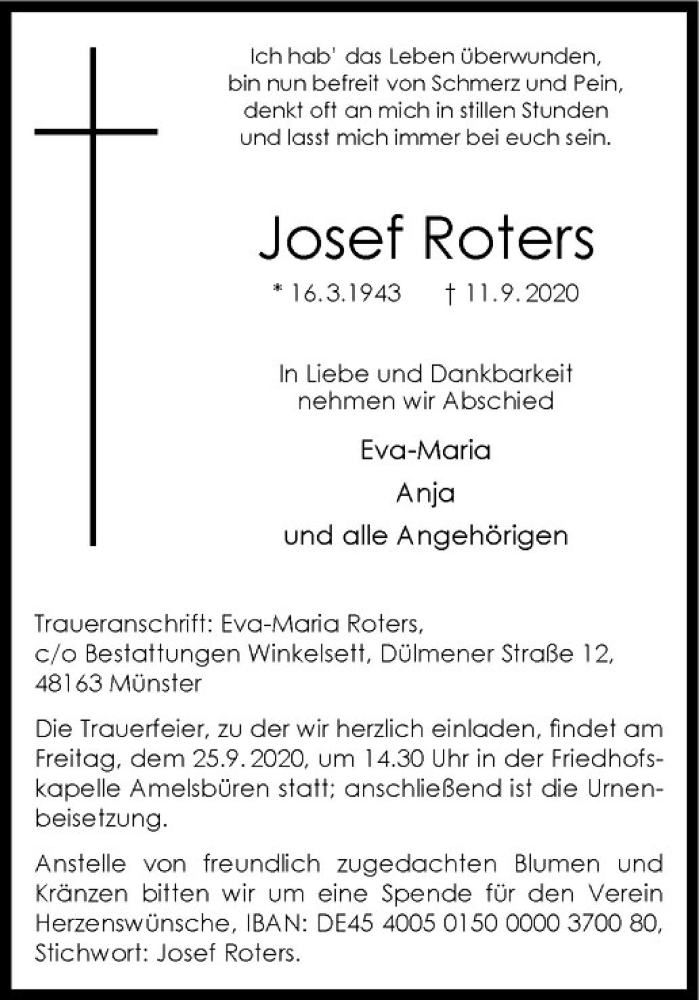 Hier finden Sie alle Traueranzeigen aus der Zeitung, die bisher für Josef Roters erschienen sind. Weitere Traueranzeigen, die in der Zeitung erscheinen, werden hier ebenfalls aufgelistet