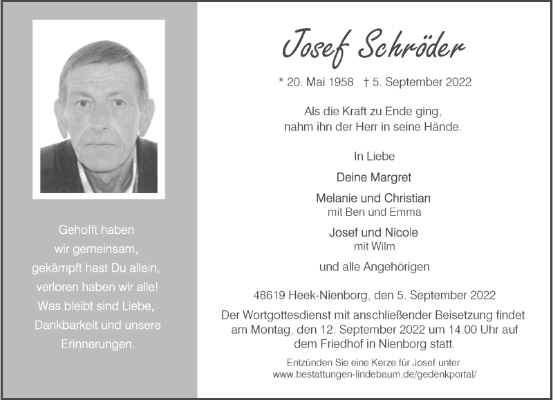 Hier finden Sie alle Traueranzeigen aus der Zeitung, die bisher für Josef Schröder erschienen sind. Weitere Traueranzeigen, die in der Zeitung erscheinen, werden hier ebenfalls aufgelistet