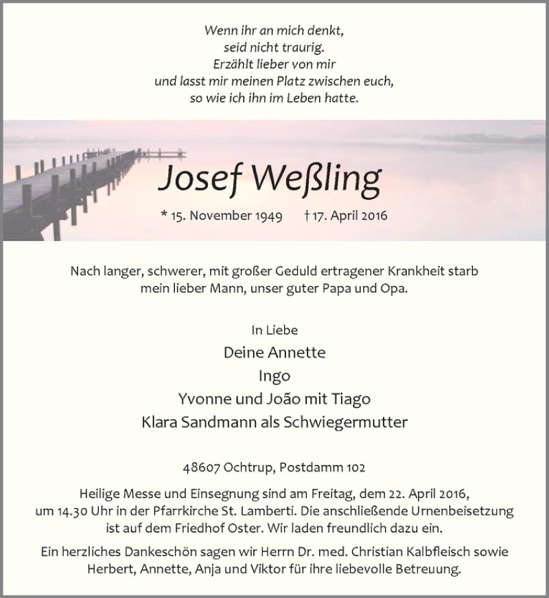 Hier finden Sie alle Traueranzeigen aus der Zeitung, die bisher für Josef Weßling erschienen sind. Weitere Traueranzeigen, die in der Zeitung erscheinen, werden hier ebenfalls aufgelistet