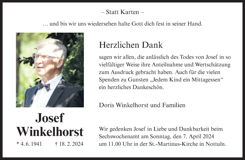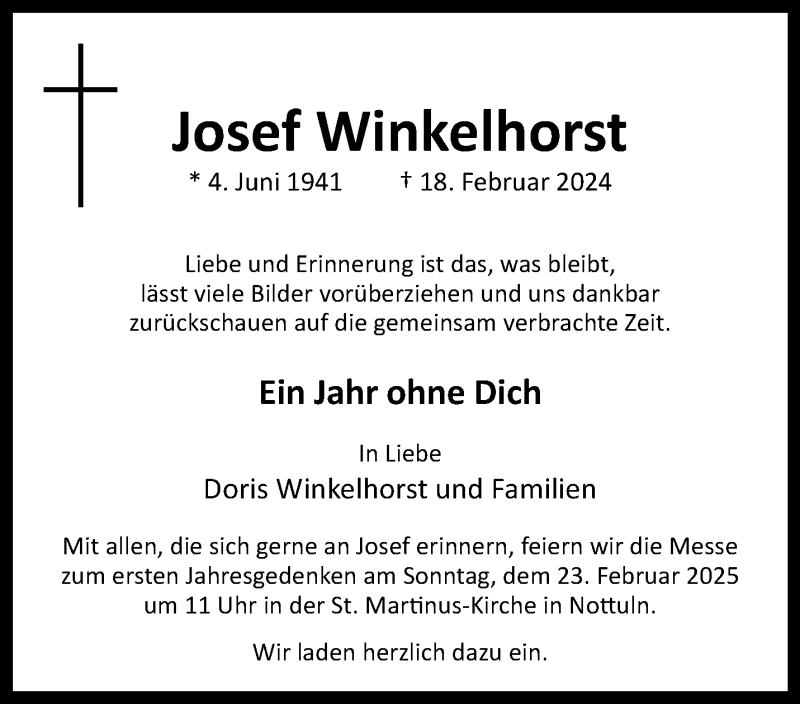 Hier finden Sie alle Traueranzeigen aus der Zeitung, die bisher für Josef Winkelhorst erschienen sind. Weitere Traueranzeigen, die in der Zeitung erscheinen, werden hier ebenfalls aufgelistet