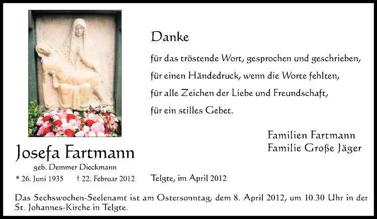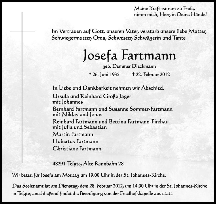 Hier finden Sie alle Traueranzeigen aus der Zeitung, die bisher für Josefa Fartmann erschienen sind. Weitere Traueranzeigen, die in der Zeitung erscheinen, werden hier ebenfalls aufgelistet