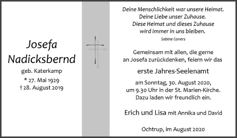 Hier finden Sie alle Traueranzeigen aus der Zeitung, die bisher für Josefa Nadicksbernd erschienen sind. Weitere Traueranzeigen, die in der Zeitung erscheinen, werden hier ebenfalls aufgelistet