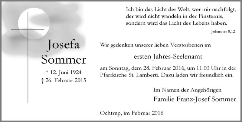 Hier finden Sie alle Traueranzeigen aus der Zeitung, die bisher für Josefa Sommer erschienen sind. Weitere Traueranzeigen, die in der Zeitung erscheinen, werden hier ebenfalls aufgelistet