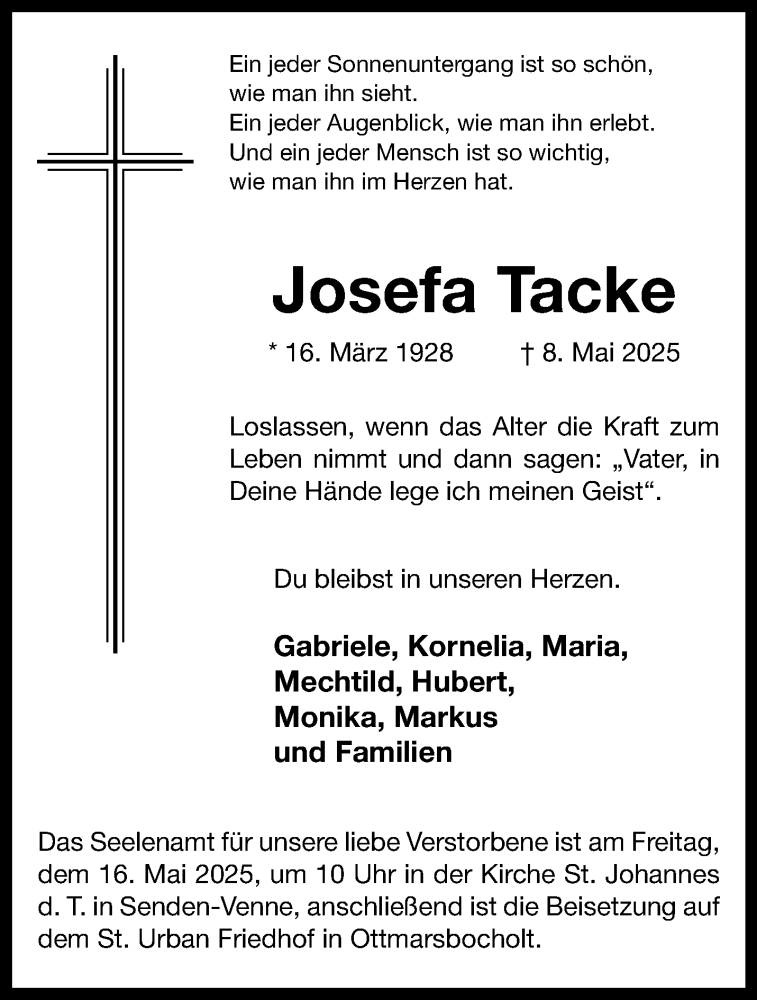 Hier finden Sie alle Traueranzeigen aus der Zeitung, die bisher für Josefa Tacke erschienen sind. Weitere Traueranzeigen, die in der Zeitung erscheinen, werden hier ebenfalls aufgelistet