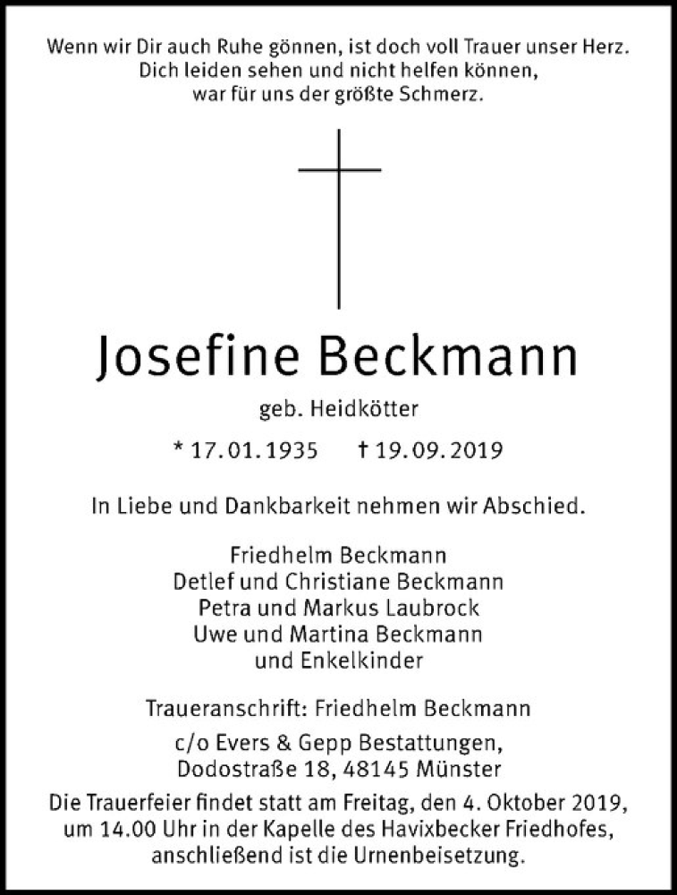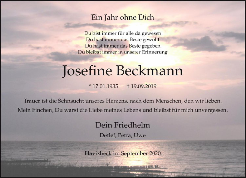 Hier finden Sie alle Traueranzeigen aus der Zeitung, die bisher für Josefine Beckmann erschienen sind. Weitere Traueranzeigen, die in der Zeitung erscheinen, werden hier ebenfalls aufgelistet