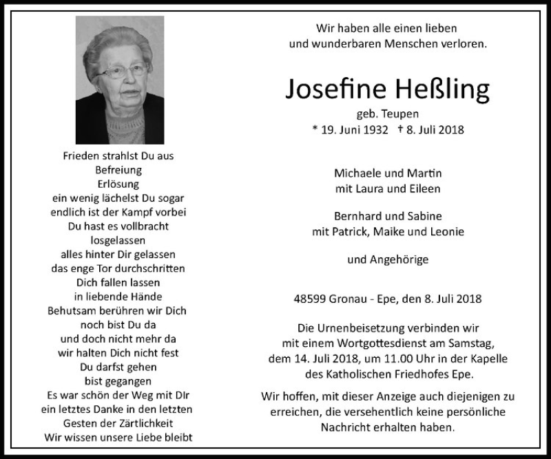 Hier finden Sie alle Traueranzeigen aus der Zeitung, die bisher für Josefine Heßling erschienen sind. Weitere Traueranzeigen, die in der Zeitung erscheinen, werden hier ebenfalls aufgelistet
