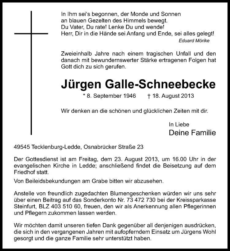 Hier finden Sie alle Traueranzeigen aus der Zeitung, die bisher für Jürgen Galle-Schneebeck erschienen sind. Weitere Traueranzeigen, die in der Zeitung erscheinen, werden hier ebenfalls aufgelistet
