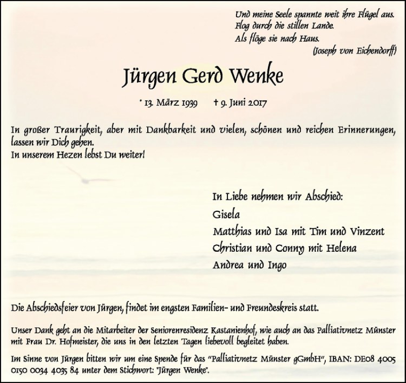 Hier finden Sie alle Traueranzeigen aus der Zeitung, die bisher für Jürgen Gerd Wenke erschienen sind. Weitere Traueranzeigen, die in der Zeitung erscheinen, werden hier ebenfalls aufgelistet