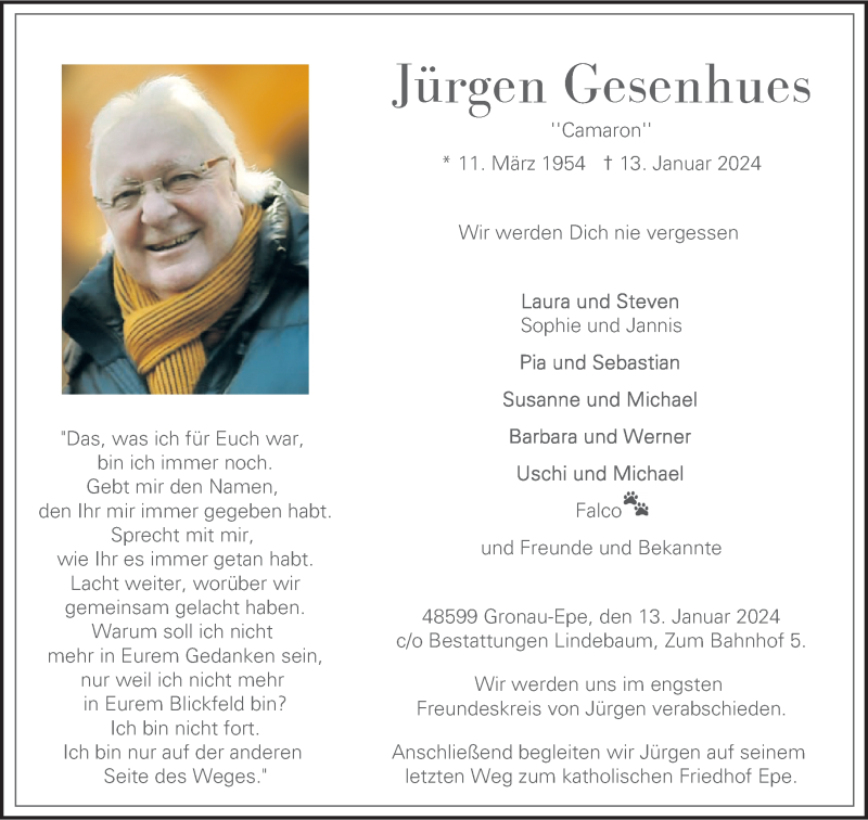 Hier finden Sie alle Traueranzeigen aus der Zeitung, die bisher für Jürgen Gesenhues erschienen sind. Weitere Traueranzeigen, die in der Zeitung erscheinen, werden hier ebenfalls aufgelistet