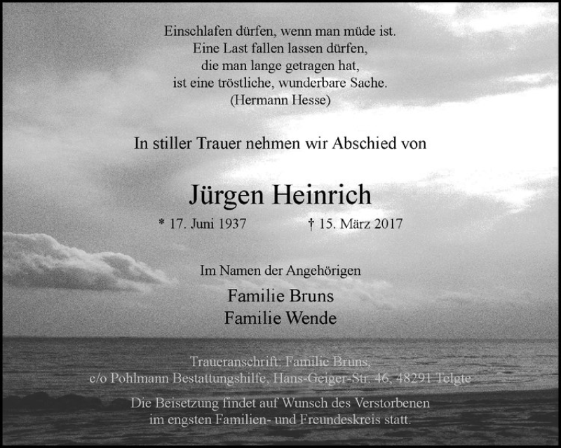 Hier finden Sie alle Traueranzeigen aus der Zeitung, die bisher für Jürgen Heinrich erschienen sind. Weitere Traueranzeigen, die in der Zeitung erscheinen, werden hier ebenfalls aufgelistet