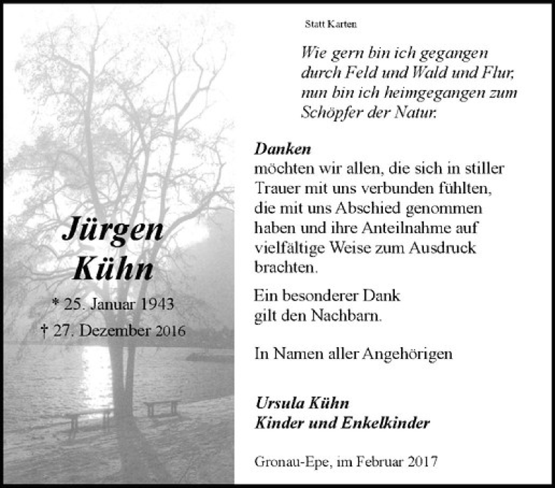Hier finden Sie alle Traueranzeigen aus der Zeitung, die bisher für Jürgen Kühn erschienen sind. Weitere Traueranzeigen, die in der Zeitung erscheinen, werden hier ebenfalls aufgelistet