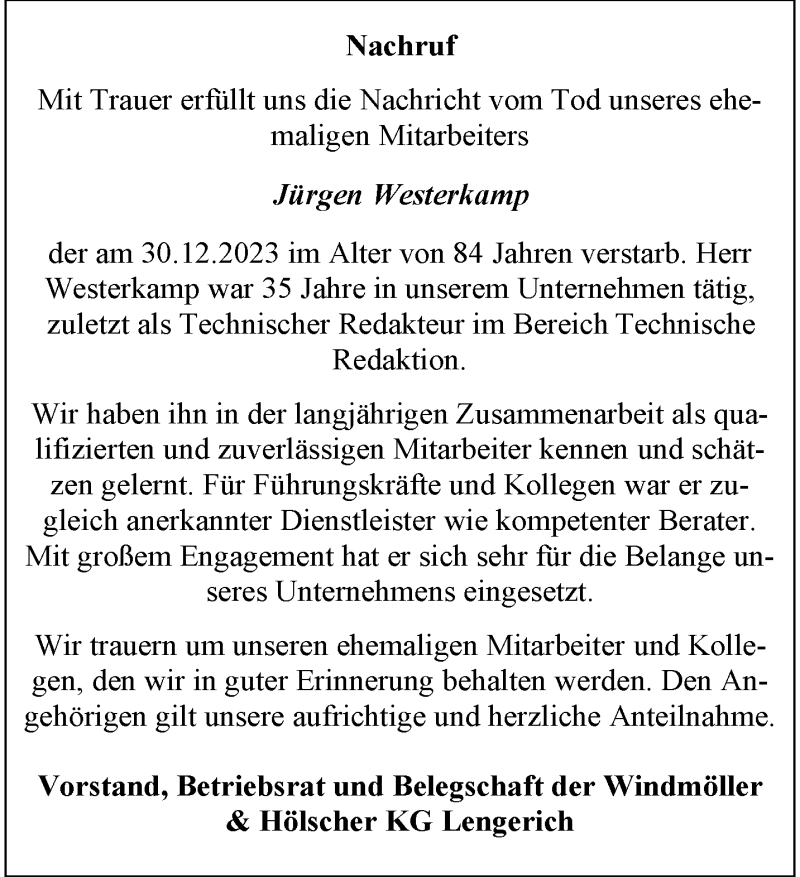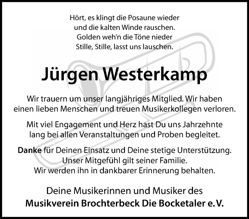 Hier finden Sie alle Traueranzeigen aus der Zeitung, die bisher für Jürgen Westerkamp erschienen sind. Weitere Traueranzeigen, die in der Zeitung erscheinen, werden hier ebenfalls aufgelistet