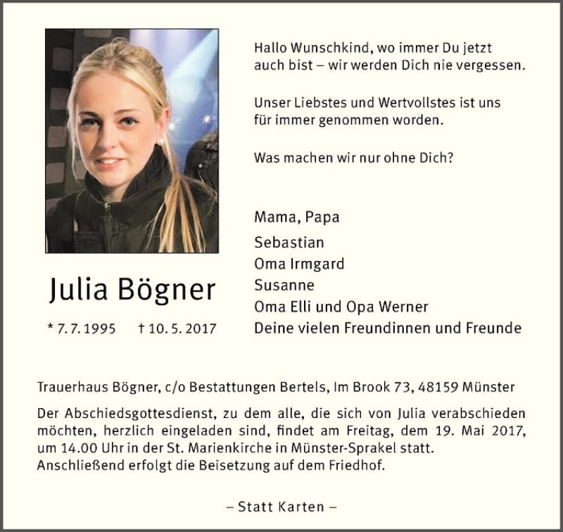 Hier finden Sie alle Traueranzeigen aus der Zeitung, die bisher für Julia Bögner erschienen sind. Weitere Traueranzeigen, die in der Zeitung erscheinen, werden hier ebenfalls aufgelistet