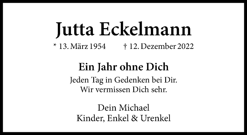 Hier finden Sie alle Traueranzeigen aus der Zeitung, die bisher für Jutta Eckelmann erschienen sind. Weitere Traueranzeigen, die in der Zeitung erscheinen, werden hier ebenfalls aufgelistet