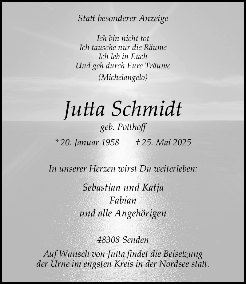 Hier finden Sie alle Traueranzeigen aus der Zeitung, die bisher für Jutta Schmidt erschienen sind. Weitere Traueranzeigen, die in der Zeitung erscheinen, werden hier ebenfalls aufgelistet